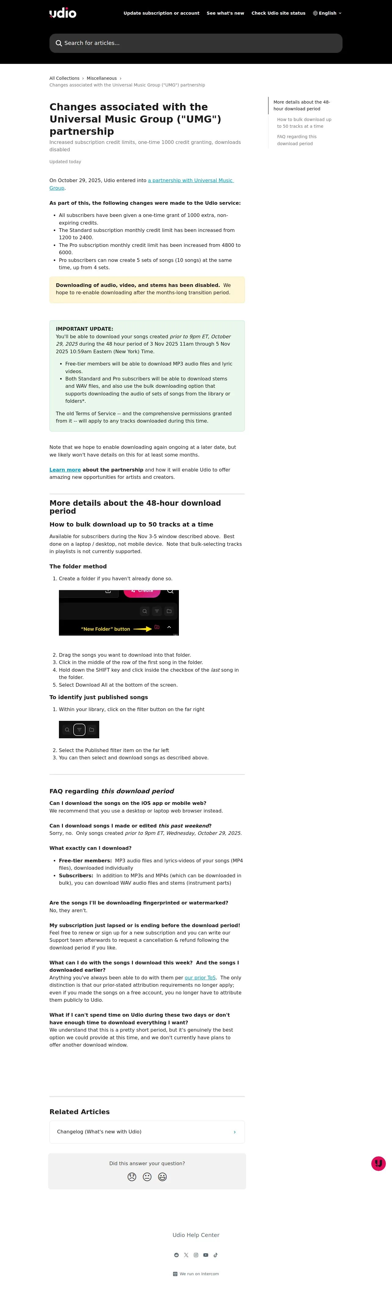 https://help.udio.com:443/en/articles/12683565-changes-associated-with-the-universal-music-group-umg-partnership
