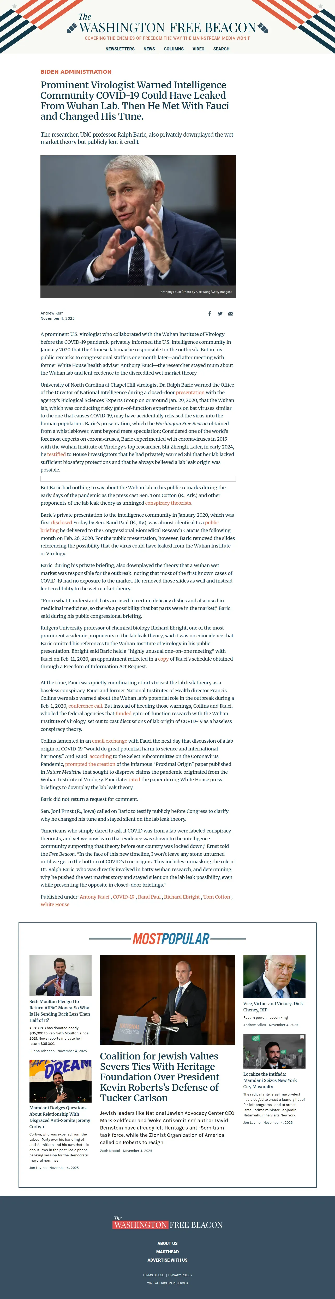 https://freebeacon.com:443/biden-administration/prominent-virologist-warned-intelligence-community-covid-19-could-have-leaked-from-wuhan-lab-then-he-met-with-fauci-and-changed-his-tune/
