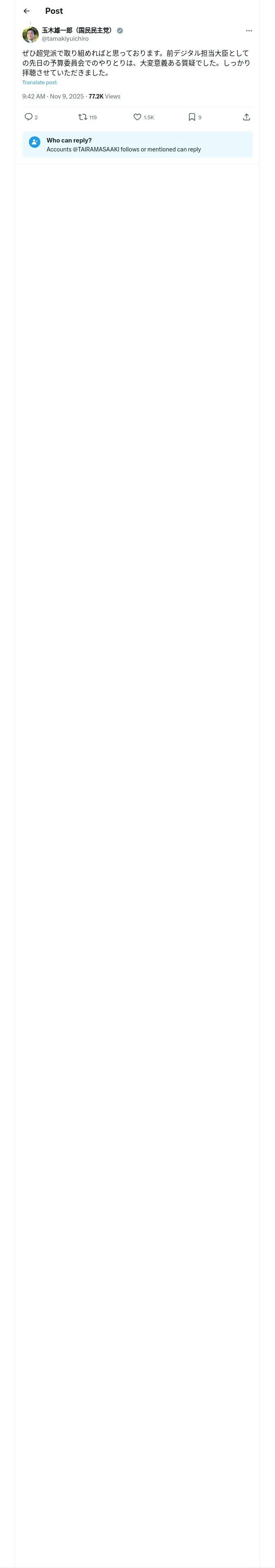 取得元URL: https://x.com:443/tamakiyuichiro/status/1987319888504074493