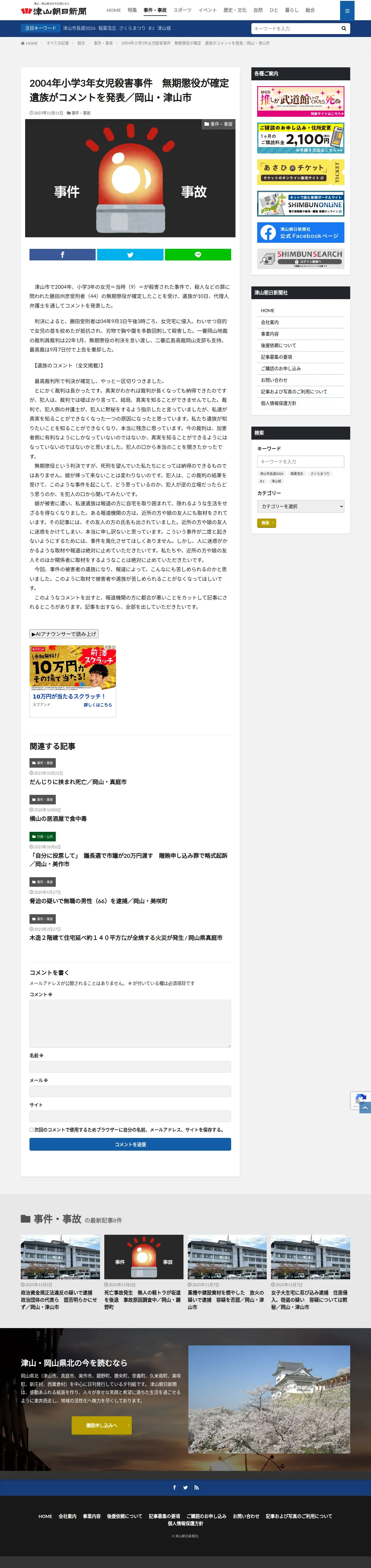 https://tsuyamaasahi.co.jp:443/2004%E5%B9%B4%E5%B0%8F%E5%AD%A63%E5%B9%B4%E5%A5%B3%E5%85%90%E6%AE%BA%E5%AE%B3%E4%BA%8B%E4%BB%B6%E3%80%80%E7%84%A1%E6%9C%9F%E6%87%B2%E5%BD%B9%E3%81%8C%E7%A2%BA%E5%AE%9A%E3%80%80%E9%81%BA%E6%97%8F/