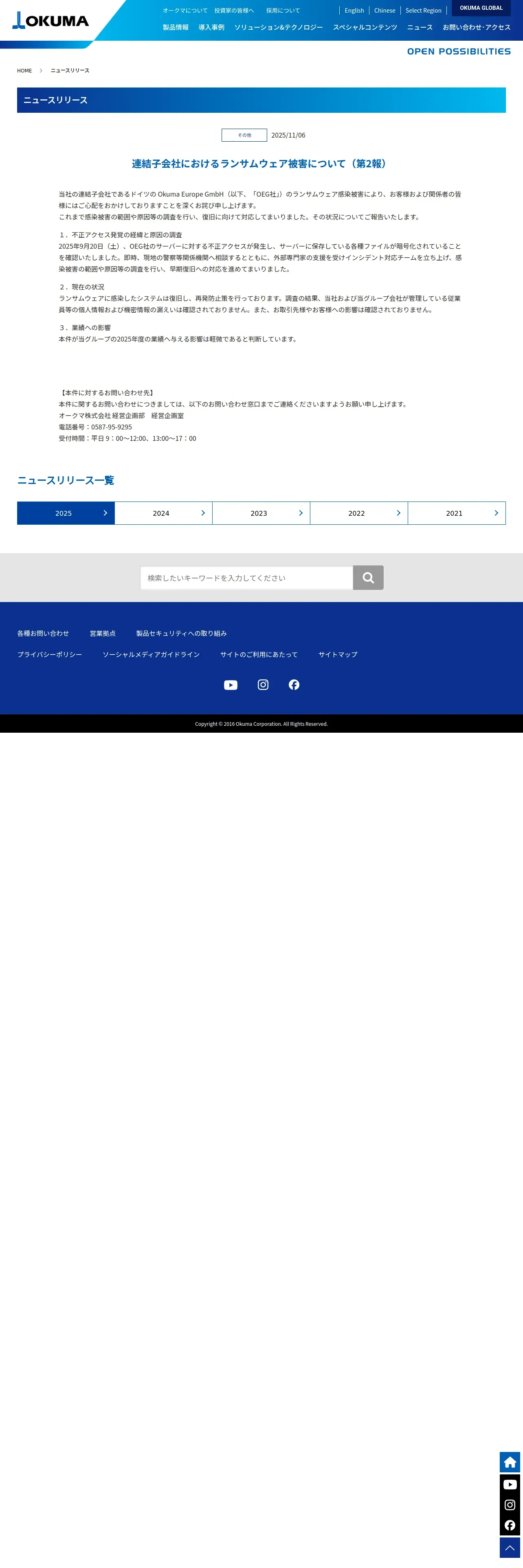 https://www.okuma.co.jp:443/news/%e9%80%a3%e7%b5%90%e5%ad%90%e4%bc%9a%e7%a4%be%e3%81%ab%e3%81%8a%e3%81%91%e3%82%8b%e3%83%a9%e3%83%b3%e3%82%b5%e3%83%a0%e3%82%a6%e3%82%a7%e3%82%a2%e8%a2%ab%e5%ae%b3%e3%81%ab%e3%81%a4%e3%81%84%e3%81%a6/