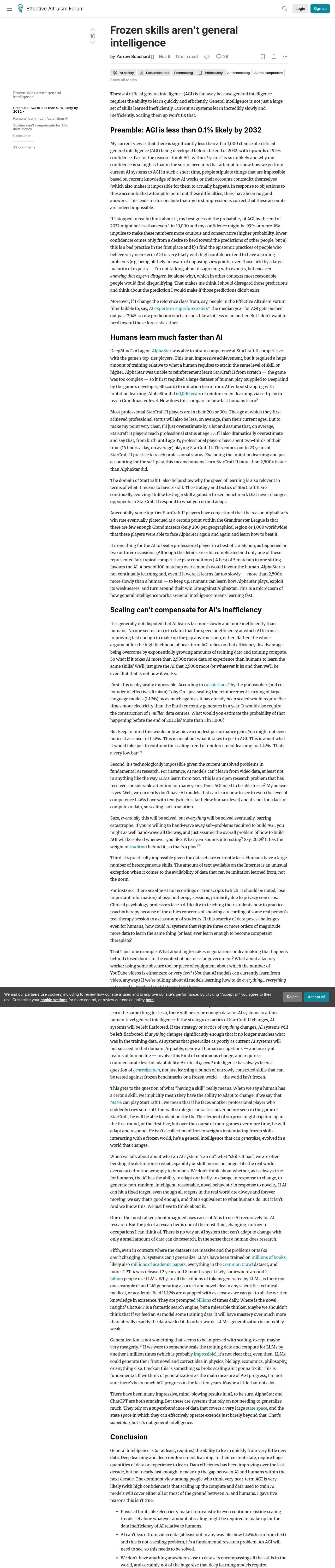 取得元URL: https://forum.effectivealtruism.org:443/posts/QGfz6MgdzJ2ADyRnF/frozen-skills-aren-t-general-intelligence