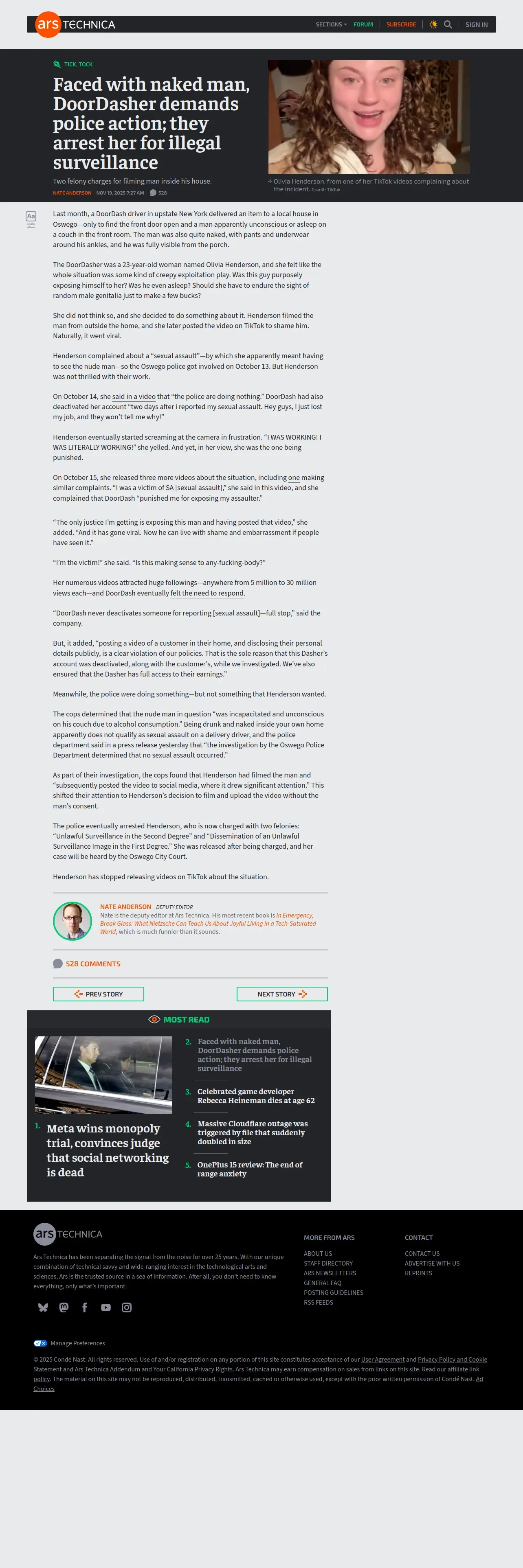 https://arstechnica.com:443/tech-policy/2025/11/doordasher-claims-sexual-assault-but-cops-arrest-her-for-filming-nude-drunk-man/