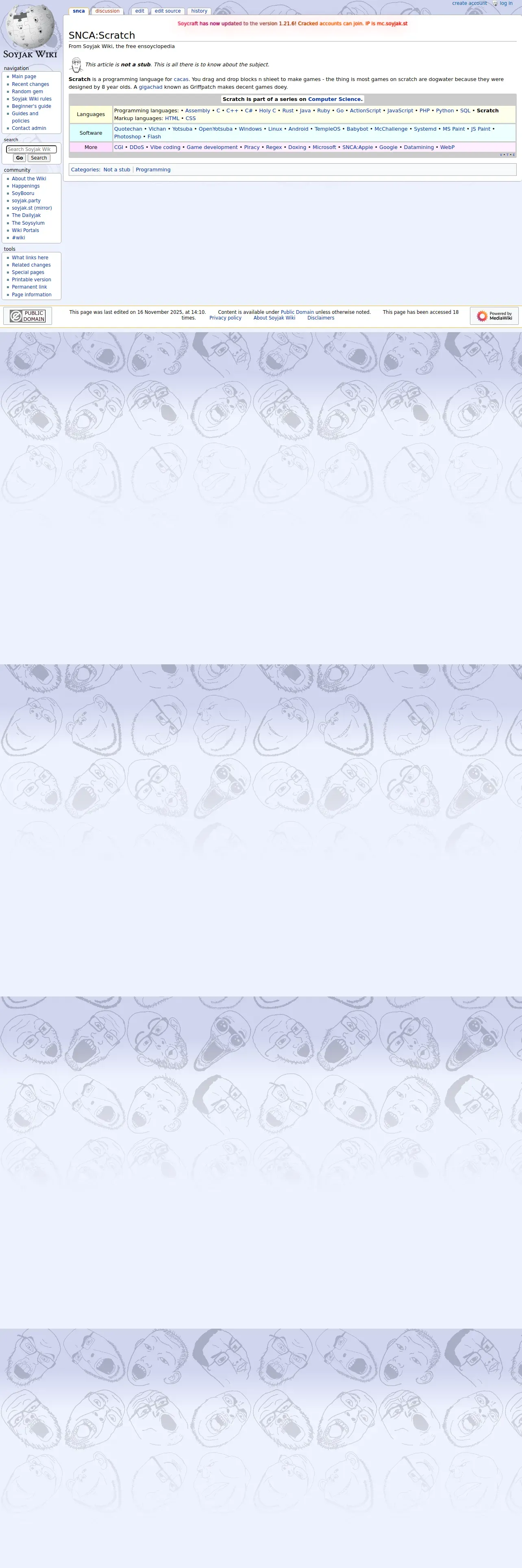 https://soyjakwiki.org:443/SNCA:Scratch