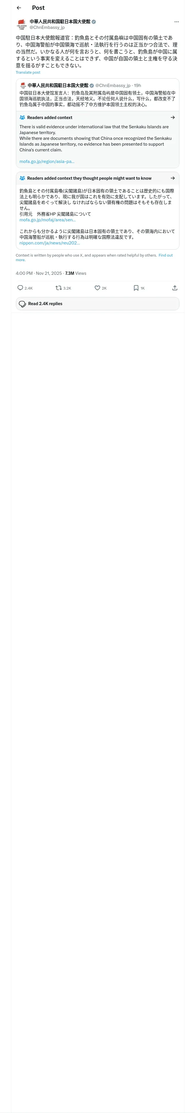 取得元URL: https://x.com:443/ChnEmbassy_jp/status/1991763537467961350