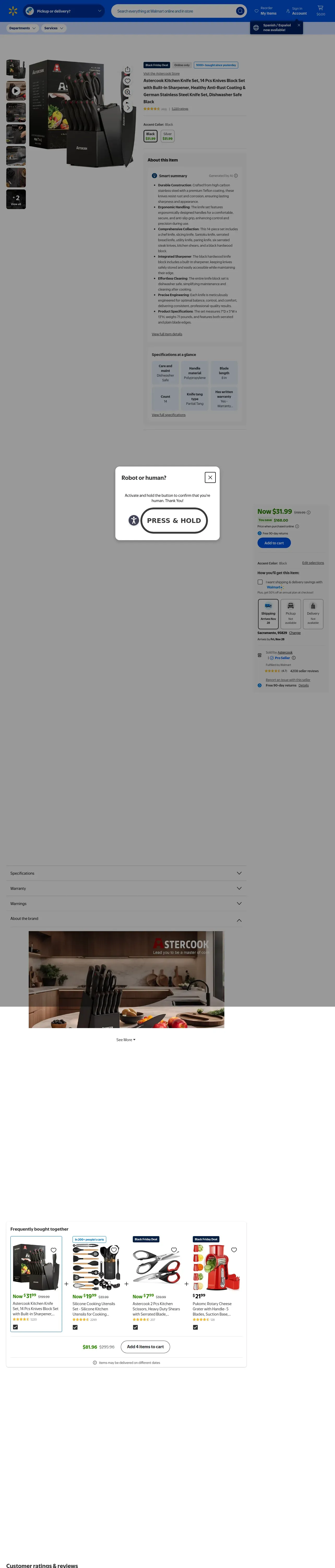 取得元URL: https://www.walmart.com:443/ip/Astercook-Kitchen-Knife-Set-15-Pcs-Knives-Block-Set-Built-in-Sharpener-Healthy-Anti-Rust-Coating-German-Stainless-Steel-Knife-Set-Dishwasher-Safe-Bla/9789509717