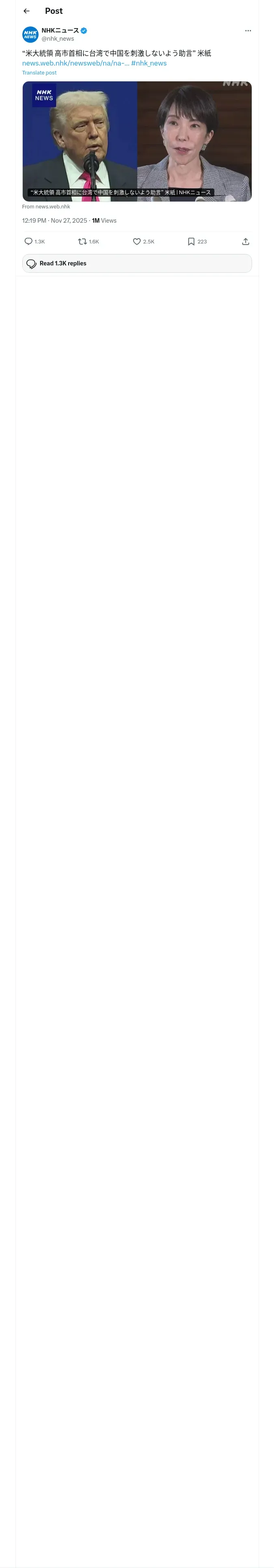 取得元URL: https://x.com:443/nhk_news/status/1993882237025308991
