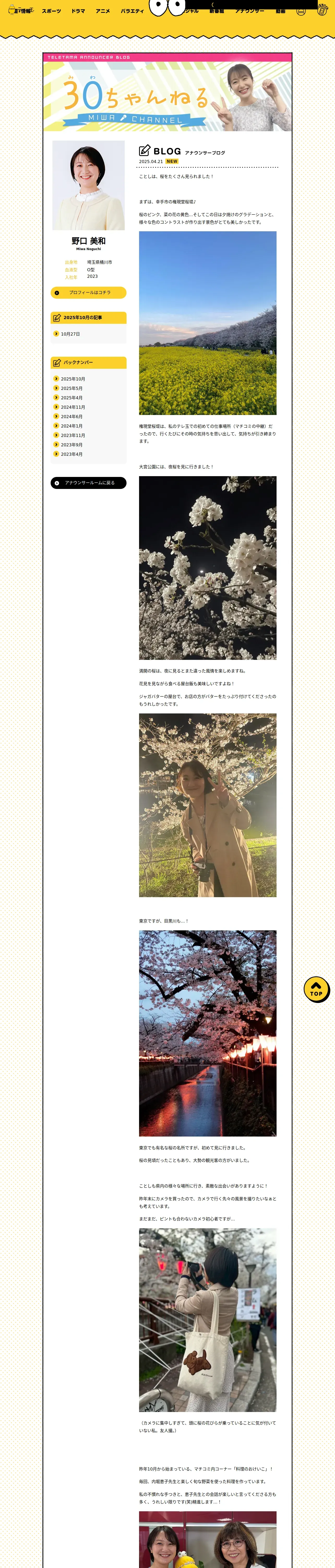 https://www.teletama.jp:443/announcer/miwa_noguchi/blog/20250421.html