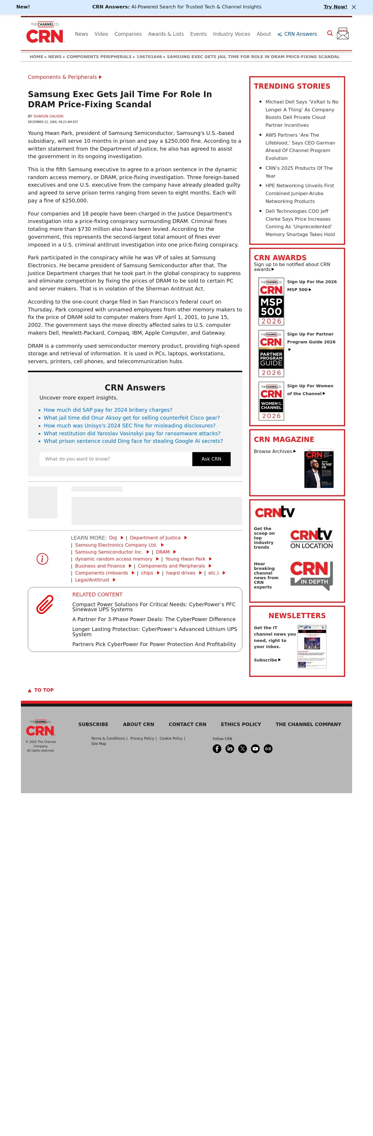 https://www.crn.com:443/news/components-peripherals/196701646/samsung-exec-gets-jail-time-for-role-in-dram-price-fixing-scandal