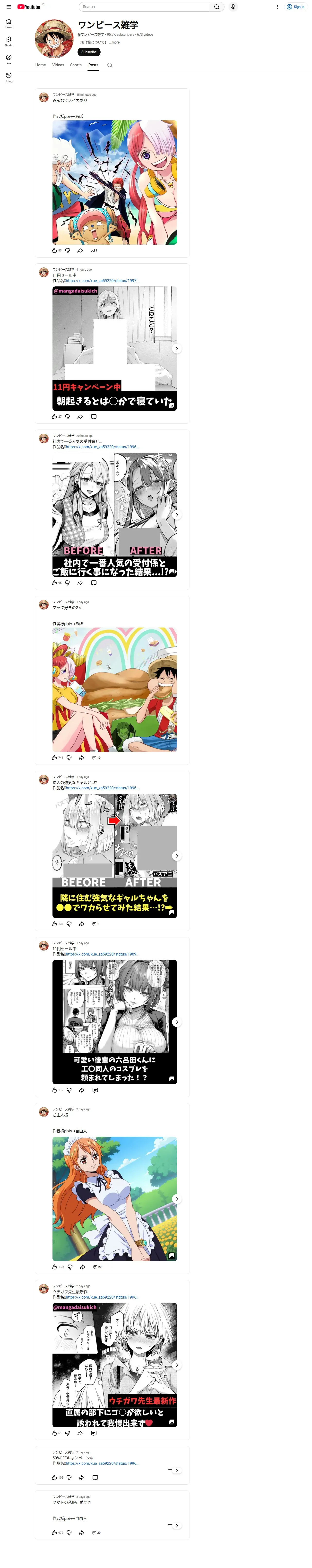 https://www.youtube.com:443/@%E3%83%AF%E3%83%B3%E3%83%94%E3%83%BC%E3%82%B9%E9%9B%91%E5%AD%A6/posts