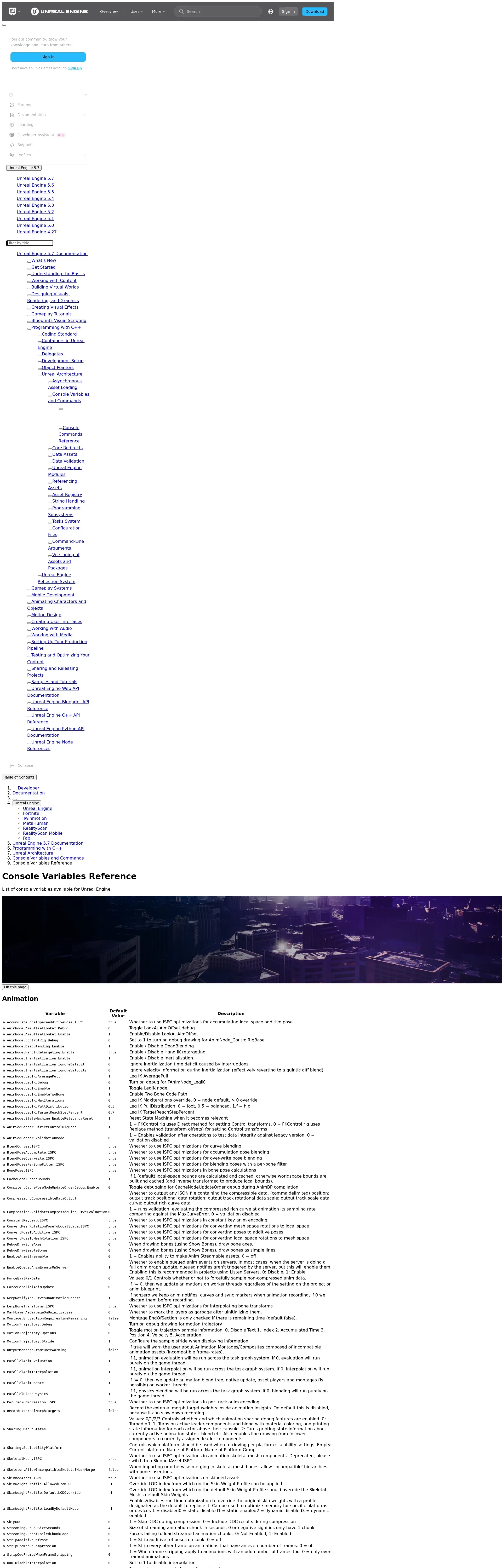 https://dev.epicgames.com:443/documentation/en-us/unreal-engine/unreal-engine-console-variables-reference