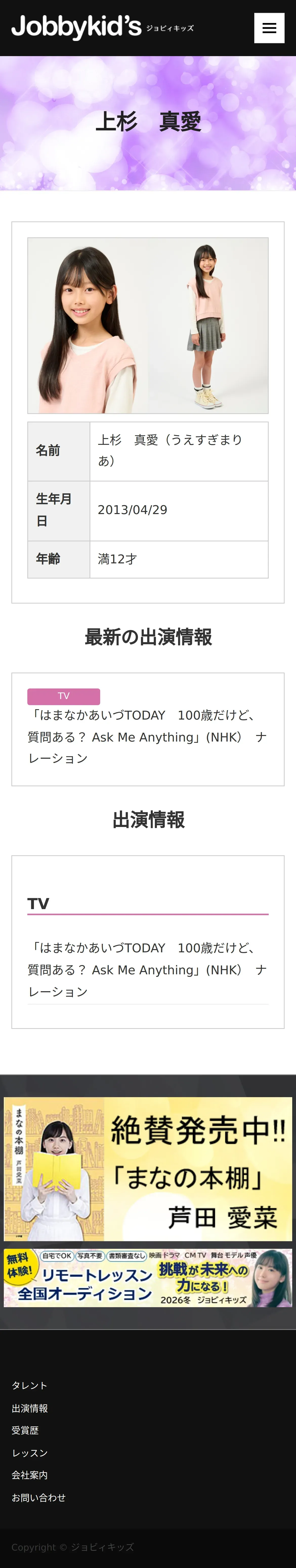 取得元URL: https://www.jobbykids.jp:443/talent/%e4%b8%8a%e6%9d%89%e7%9c%9f%e6%84%9b/
