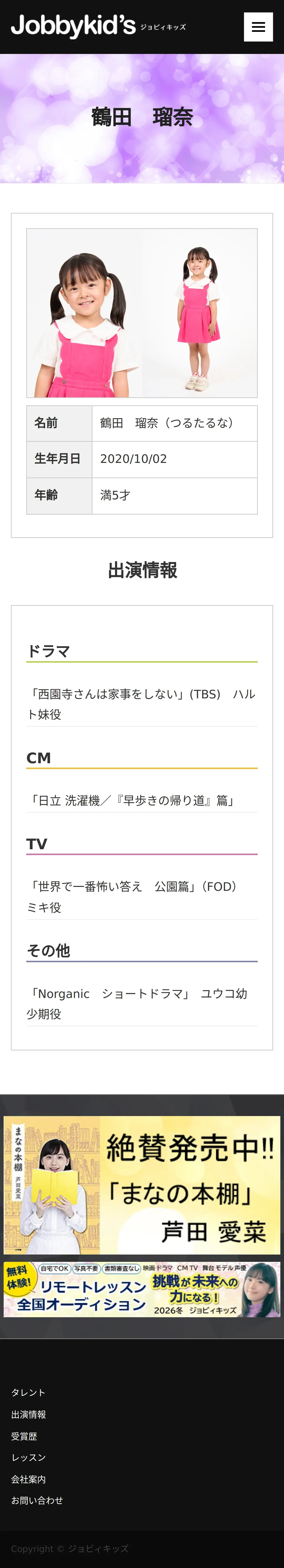 https://www.jobbykids.jp:443/talent/%e9%b6%b4%e7%94%b0%e7%91%a0%e5%a5%88/