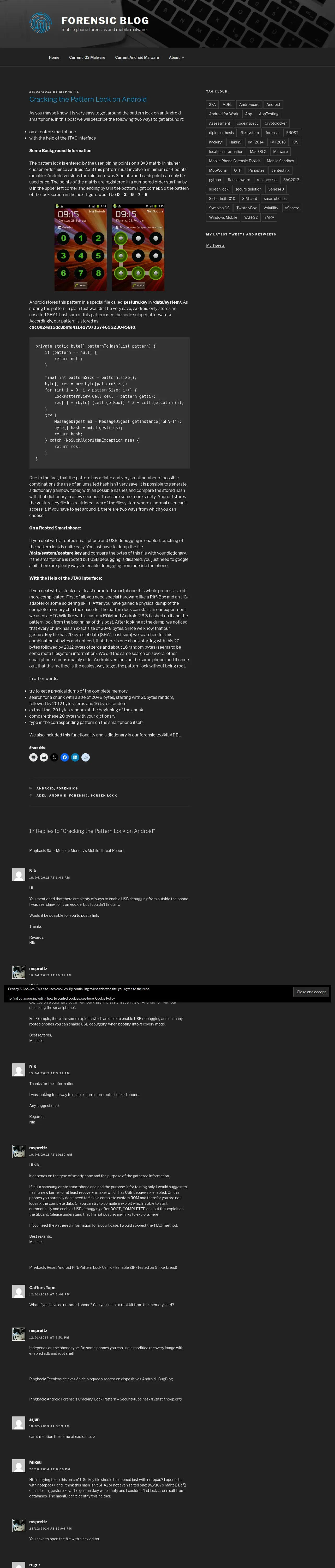 https://forensics.spreitzenbarth.de:443/2012/02/28/cracking-the-pattern-lock-on-android/