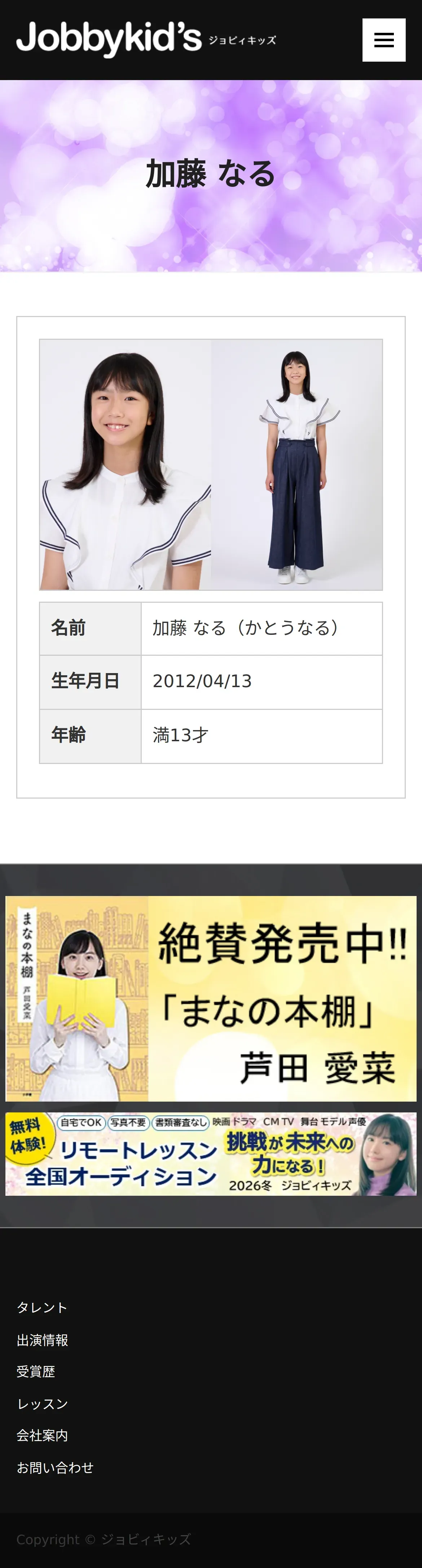 取得元URL: https://www.jobbykids.jp:443/talent/%e5%8a%a0%e8%97%a4%e3%81%aa%e3%82%8b/