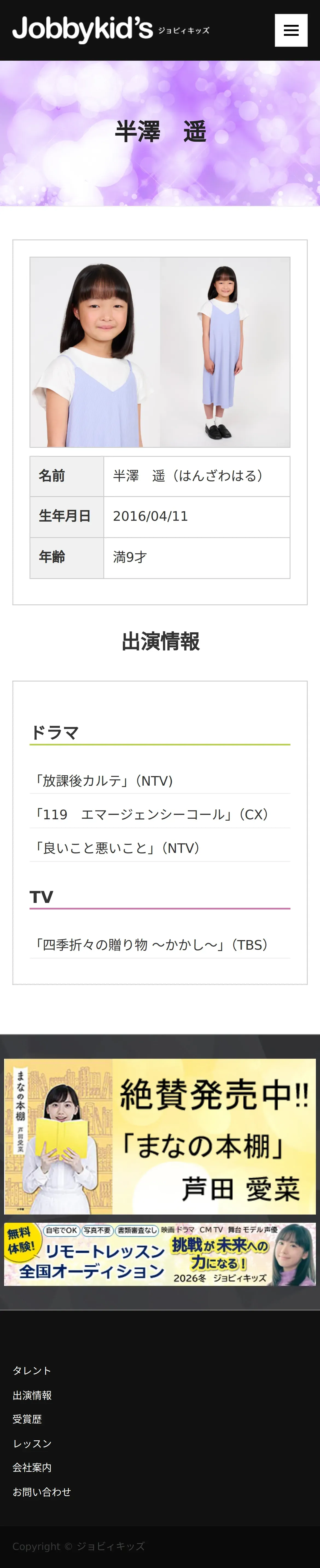 取得元URL: https://www.jobbykids.jp:443/talent/%e5%8d%8a%e6%be%a4%e9%81%a5/
