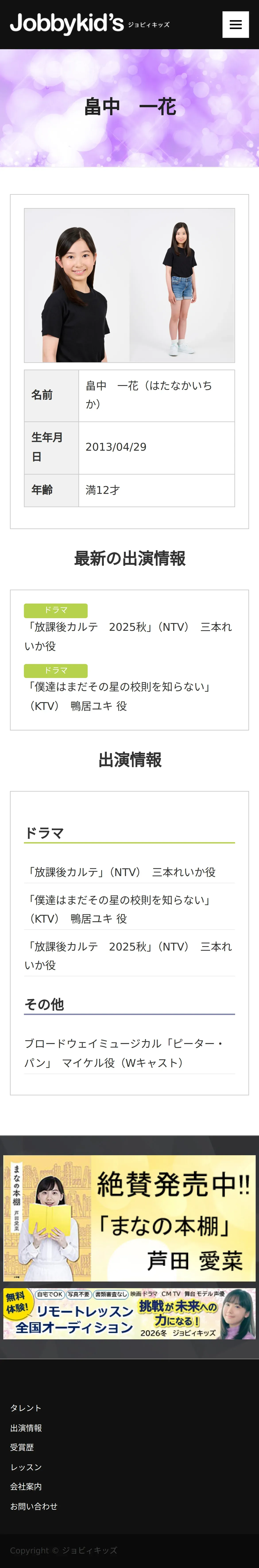 取得元URL: https://www.jobbykids.jp:443/talent/%e7%95%a0%e4%b8%ad%e4%b8%80%e8%8a%b1/