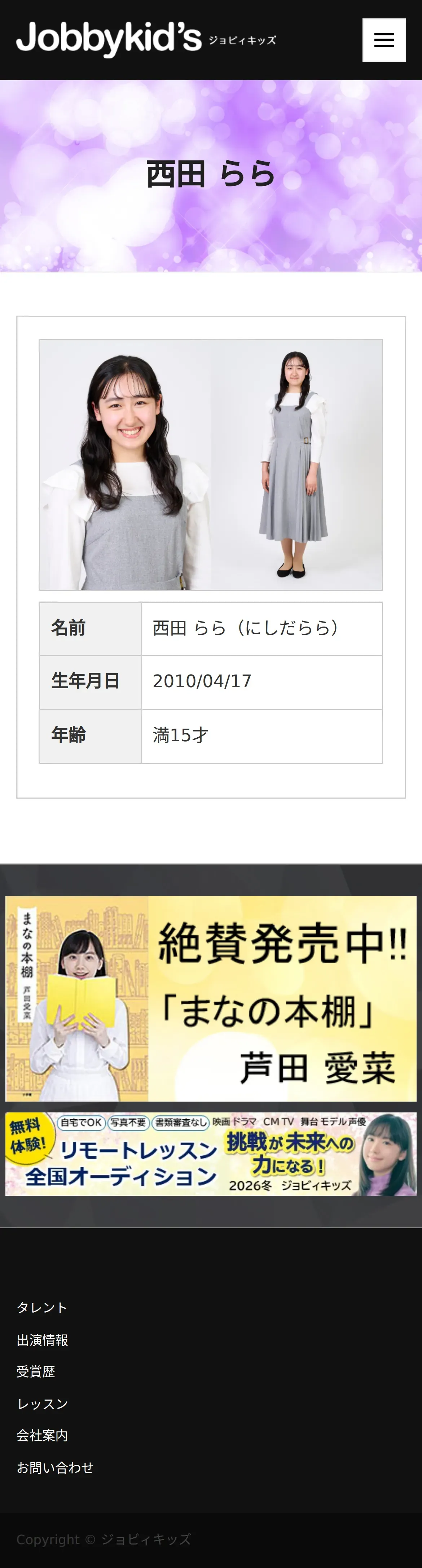 https://www.jobbykids.jp:443/talent/%e8%a5%bf%e7%94%b0%e3%82%89%e3%82%89/