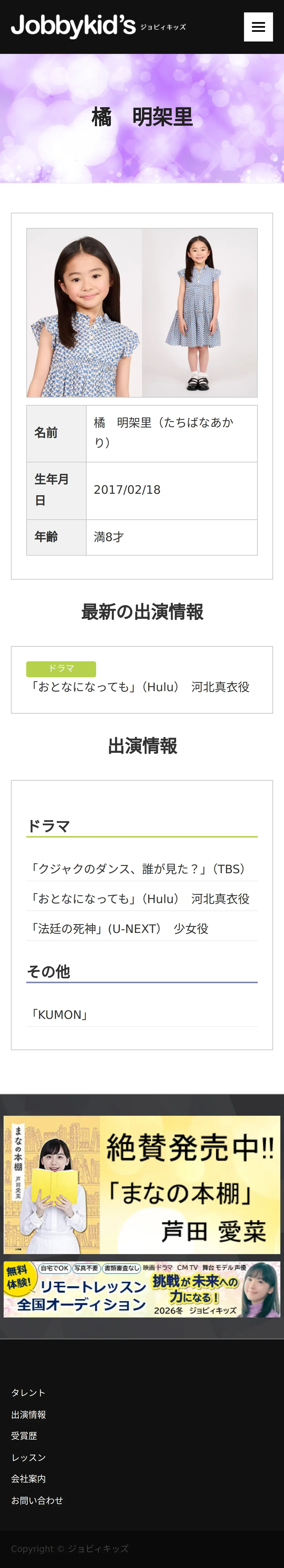 取得元URL: https://www.jobbykids.jp:443/talent/%E6%A9%98%E6%98%8E%E6%9E%B6%E9%87%8C/