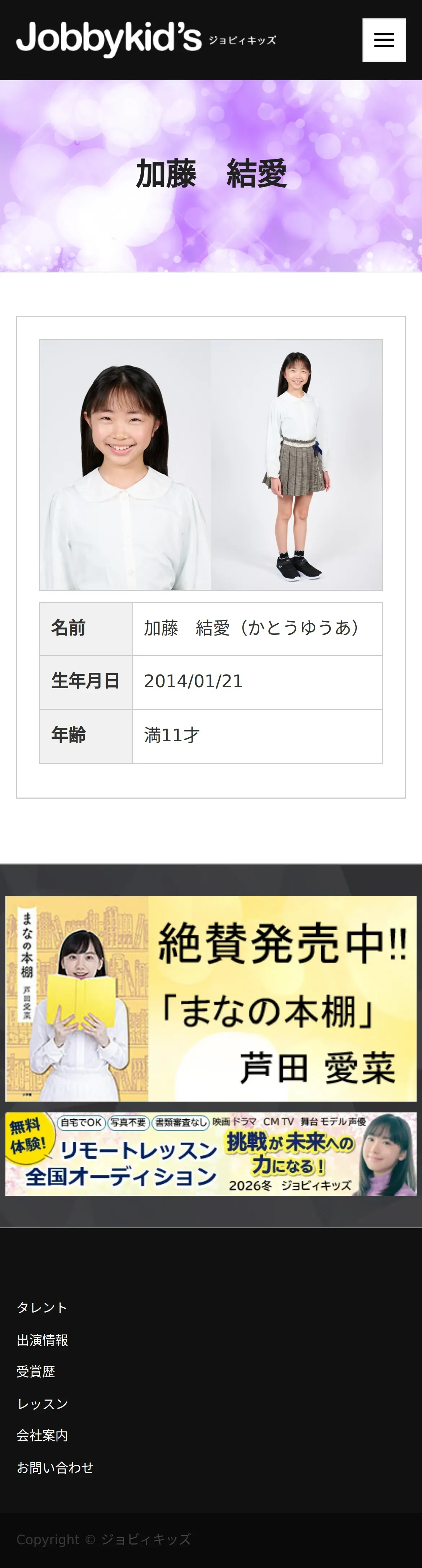 取得元URL: https://www.jobbykids.jp:443/talent/%E5%8A%A0%E8%97%A4%E7%B5%90%E6%84%9B/