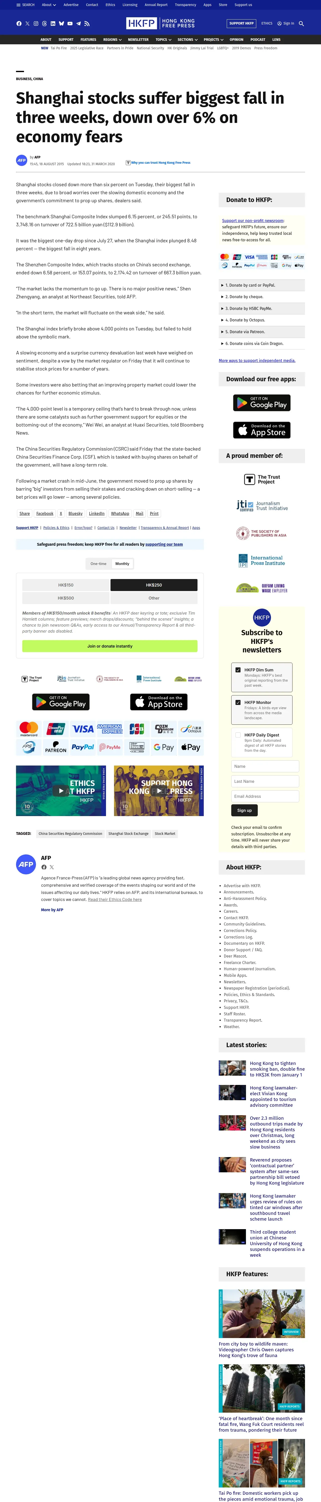 https://hongkongfp.com:443/2015/08/18/shanghai-stocks-suffer-biggest-fall-in-three-weeks-down-over-6-on-economy-fears/