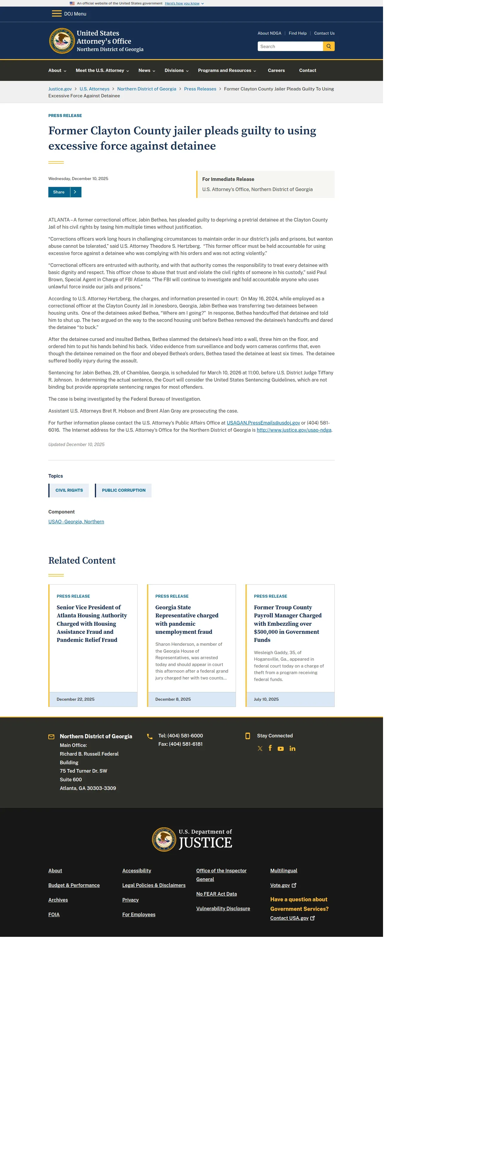 https://www.justice.gov:443/usao-ndga/pr/former-clayton-county-jailer-pleads-guilty-using-excessive-force-against-detainee