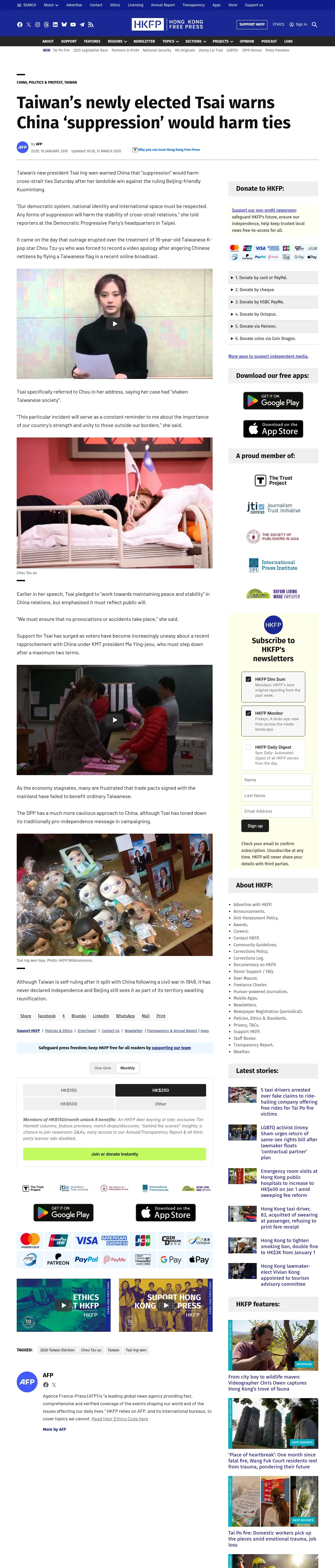 https://hongkongfp.com:443/2016/01/16/taiwans-newly-elected-tsai-warns-china-suppression-would-harm-ties/