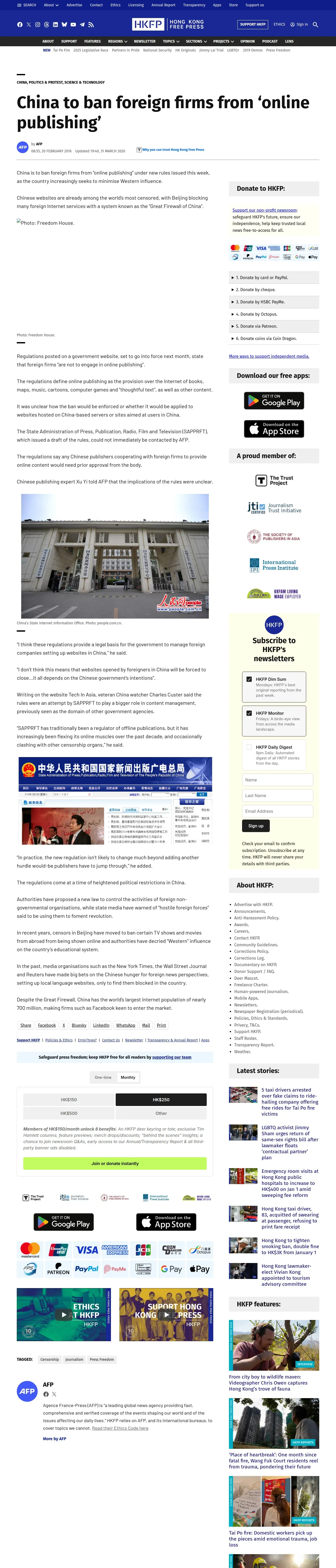 https://hongkongfp.com:443/2016/02/20/china-to-ban-foreign-firms-from-online-publishing/