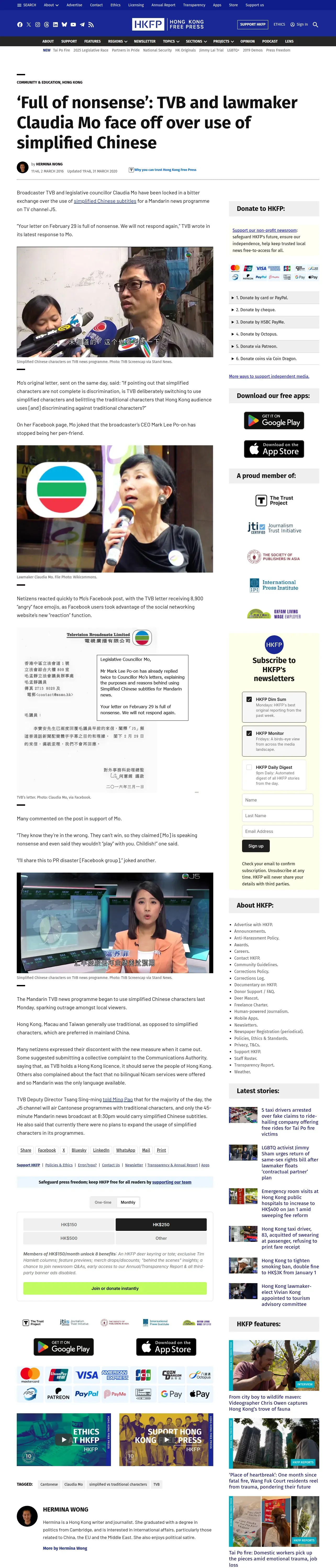 取得元URL: https://hongkongfp.com:443/2016/03/02/full-of-nonsense-tvb-and-lawmaker-claudia-mo-face-off-over-use-of-simplified-chinese/