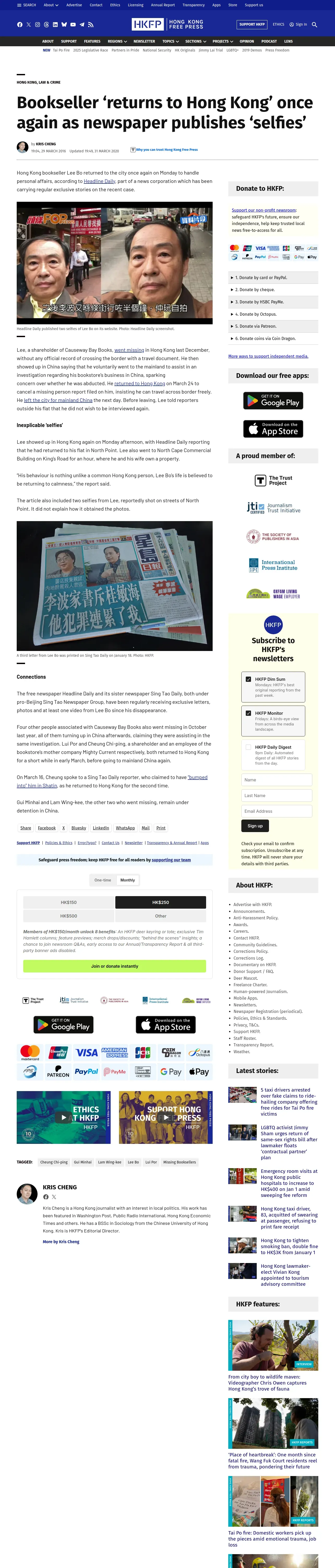 https://hongkongfp.com:443/2016/03/29/bookseller-returns-to-hong-kong-once-again-as-newspaper-publishes-selfies/