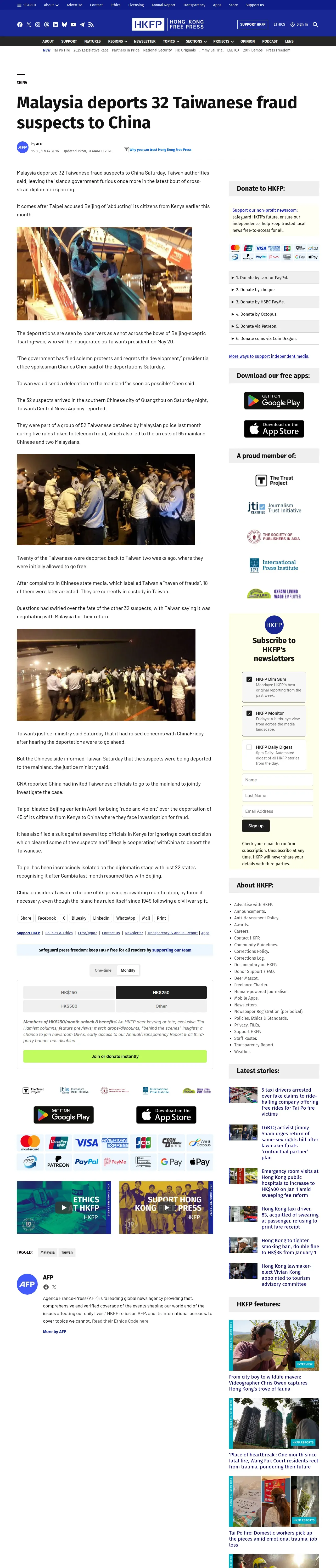 取得元URL: https://hongkongfp.com:443/2016/05/01/malaysia-deports-32-taiwanese-fraud-suspects-to-china/