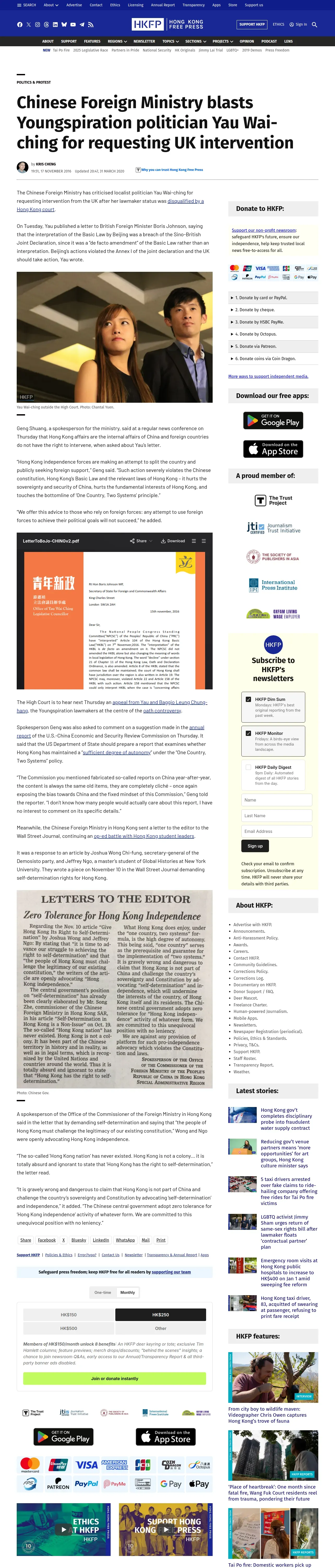 取得元URL: https://hongkongfp.com:443/2016/11/17/chinese-foreign-ministry-blasts-youngspiration-politician-yau-wai-ching-requesting-uk-intervention/
