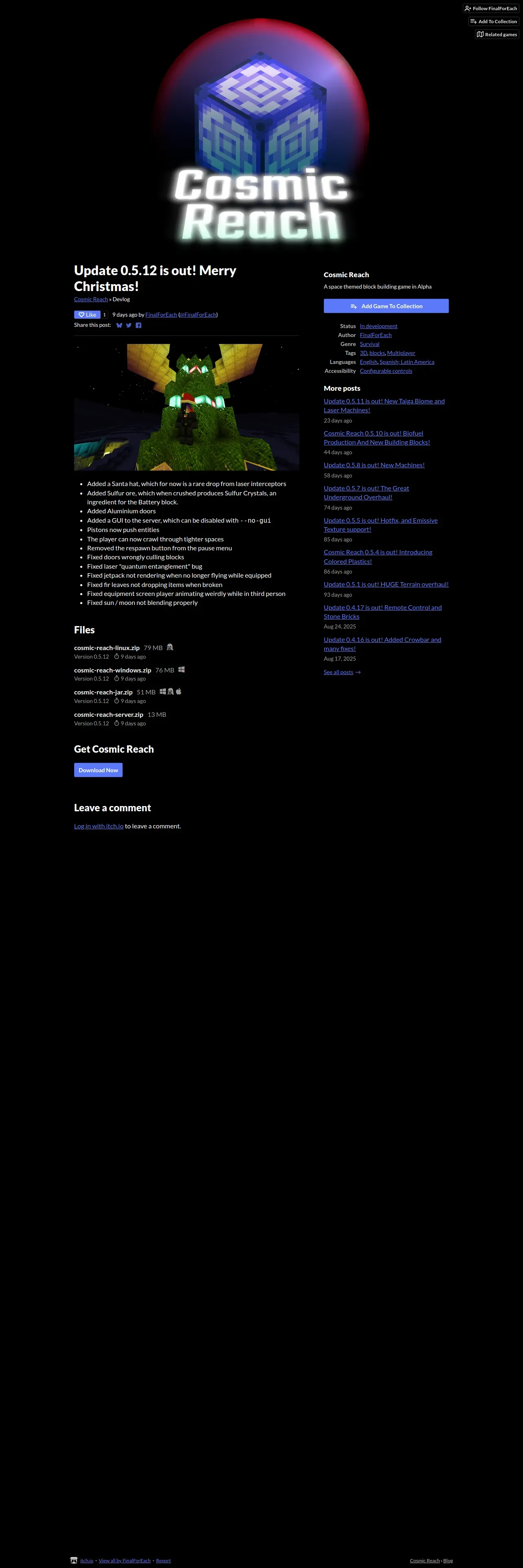 https://finalforeach.itch.io:443/cosmic-reach/devlog/1165474/update-0512-is-out-merry-christmas