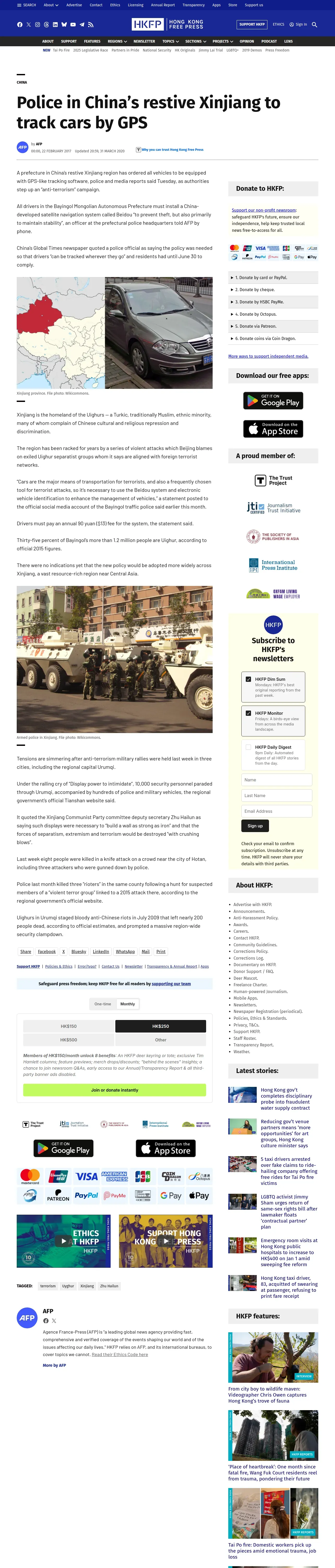https://hongkongfp.com:443/2017/02/22/police-chinas-restive-xinjiang-track-cars-gps/