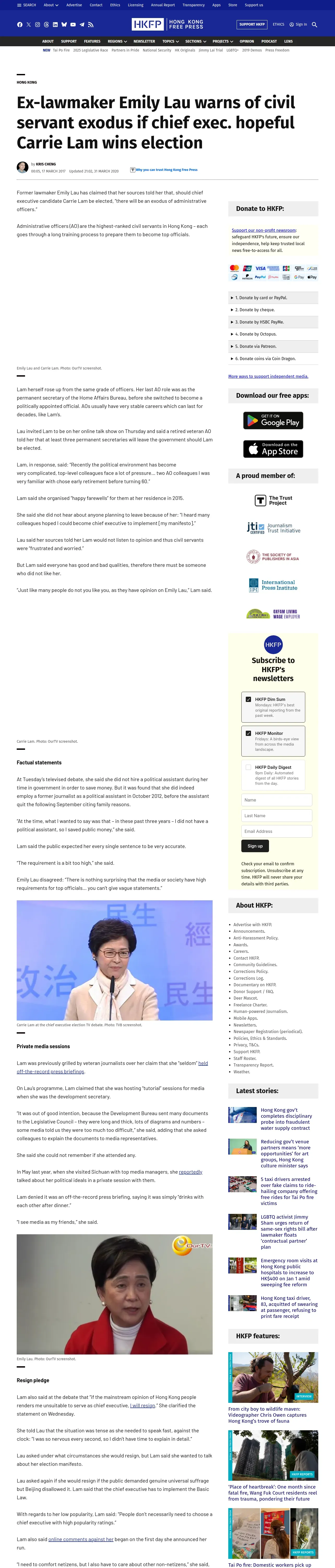 取得元URL: https://hongkongfp.com:443/2017/03/17/ex-lawmaker-emily-lau-warns-civil-servant-exodus-chief-exec-hopeful-carrie-lam-wins-election/