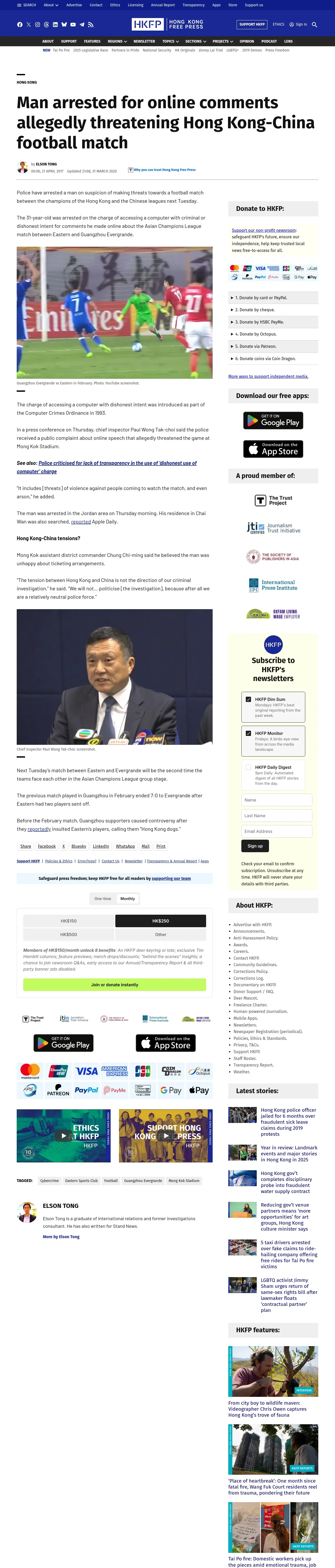 https://hongkongfp.com:443/2017/04/21/man-arrested-online-comments-allegedly-threatening-hong-kong-china-football-match/