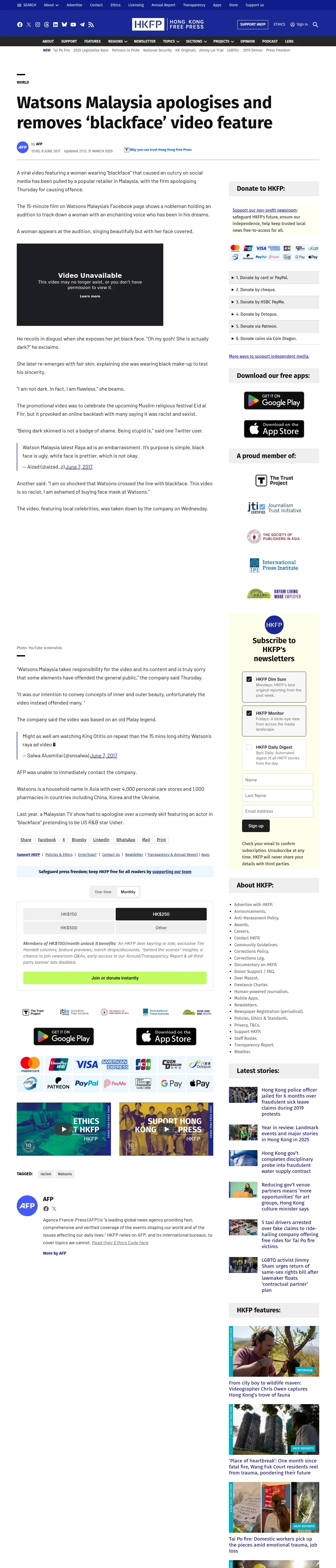 取得元URL: https://hongkongfp.com:443/2017/06/08/watsons-malaysia-apologises-removes-blackface-video-feature/