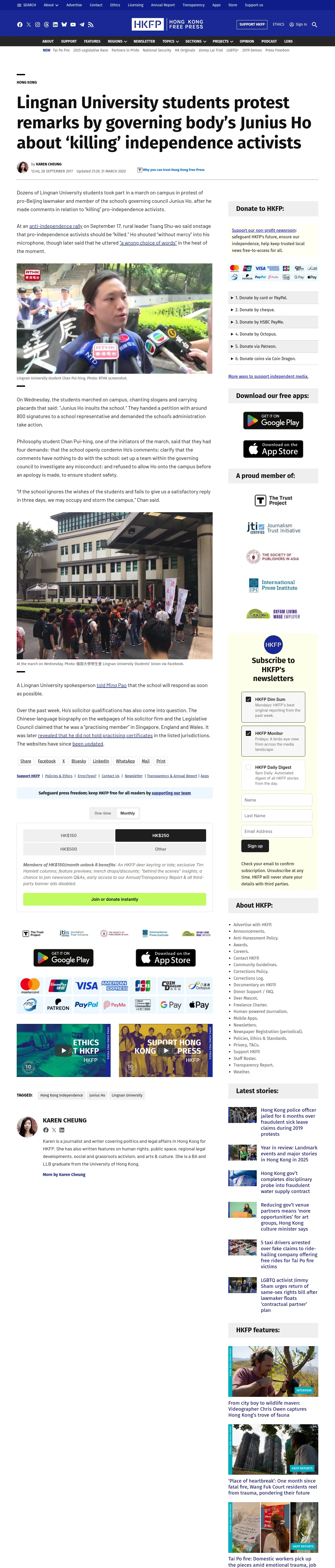 取得元URL: https://hongkongfp.com:443/2017/09/28/lingnan-university-students-protest-remarks-governing-bodys-junius-ho-killing-independence-activists/
