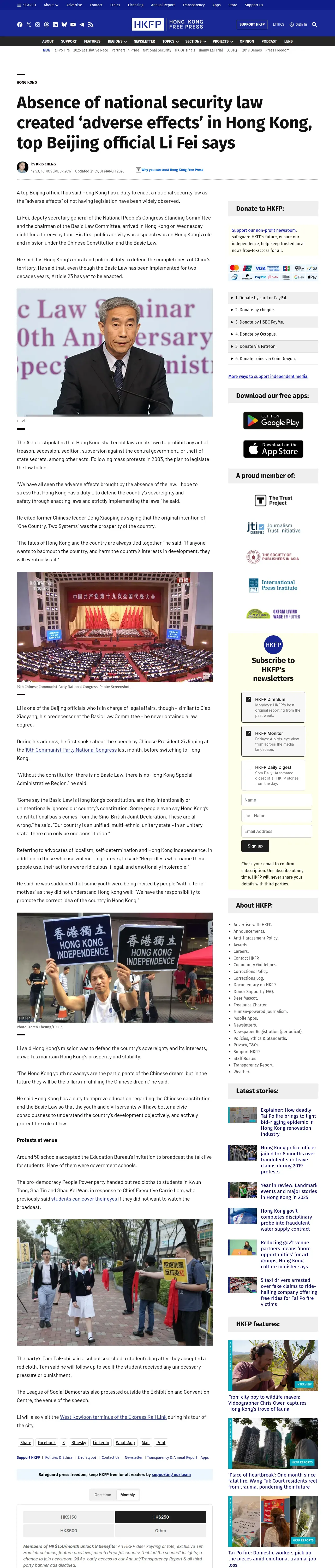 https://hongkongfp.com:443/2017/11/16/absence-national-security-law-created-adverse-effects-hong-kong-top-beijing-official-li-fei-says/