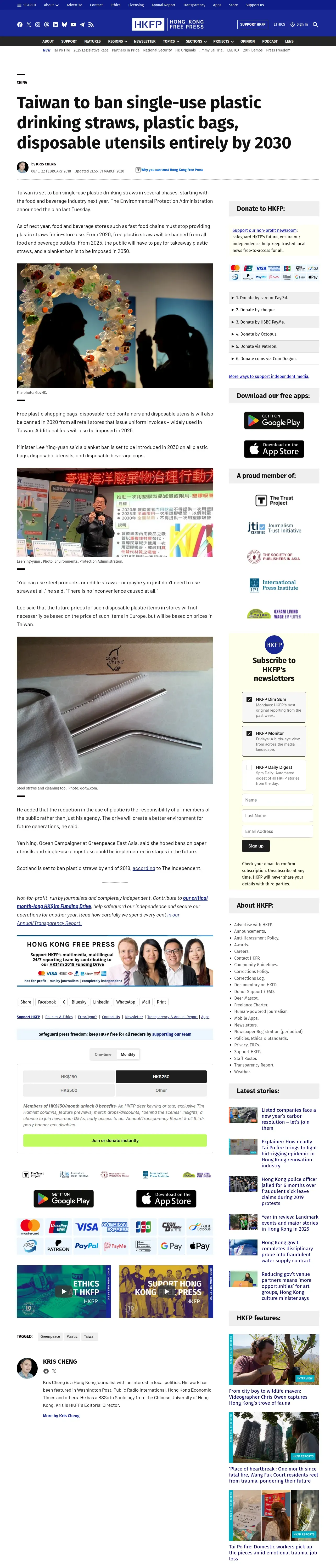 https://hongkongfp.com:443/2018/02/22/taiwan-ban-single-use-plastic-drinking-straws-plastic-bags-disposable-utensils-entirely-2030/