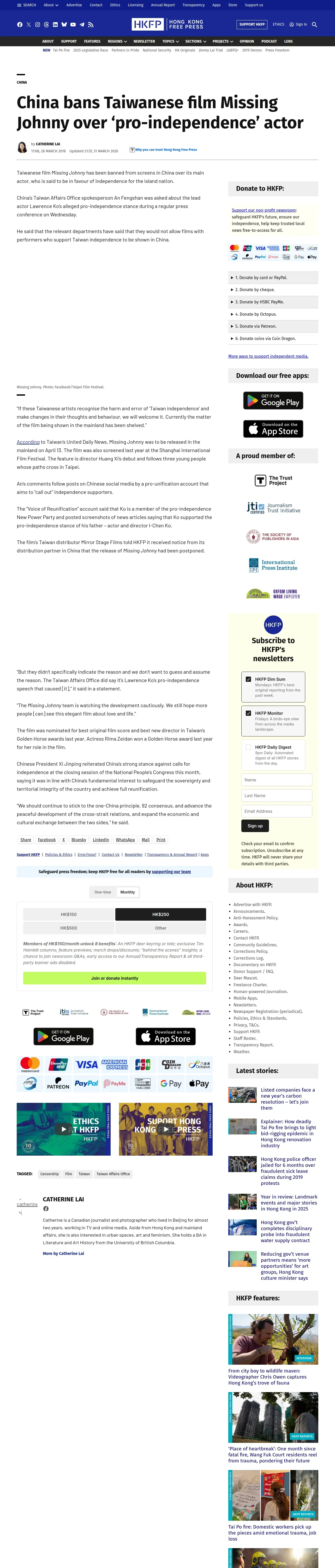 https://hongkongfp.com:443/2018/03/28/china-bans-taiwanese-film-missing-johnny-pro-independence-actor/