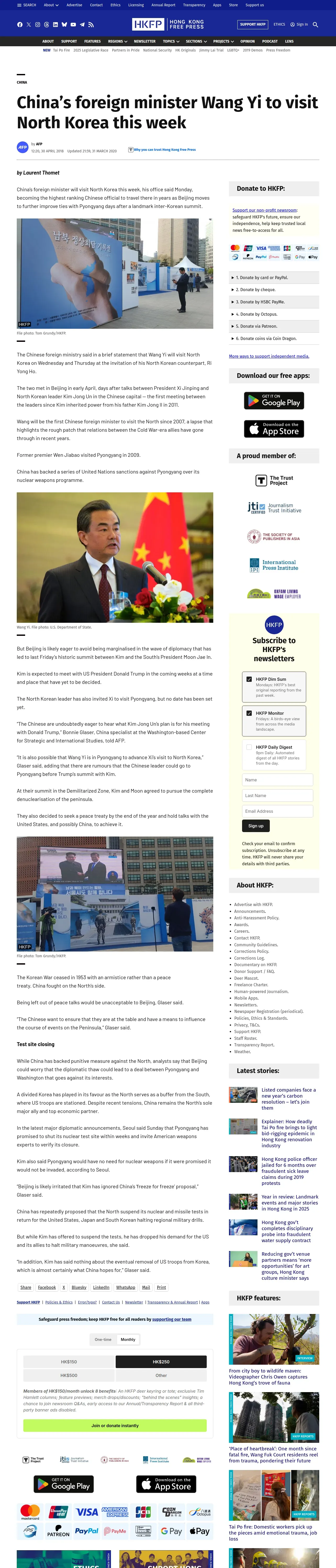 https://hongkongfp.com:443/2018/04/30/chinas-foreign-minister-wang-yi-visit-north-korea-week/