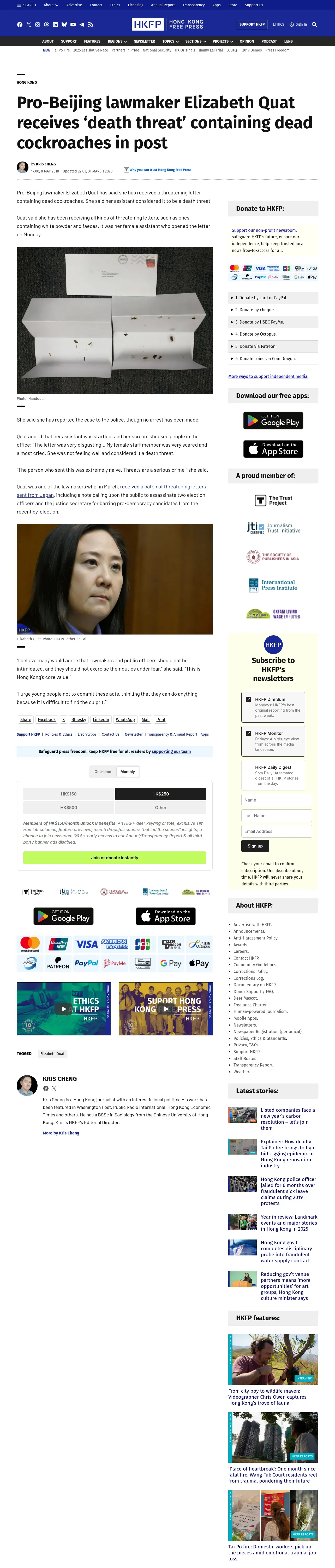取得元URL: https://hongkongfp.com:443/2018/05/08/pro-beijing-lawmaker-elizabeth-quat-receives-death-threat-containing-dead-cockroaches-post/