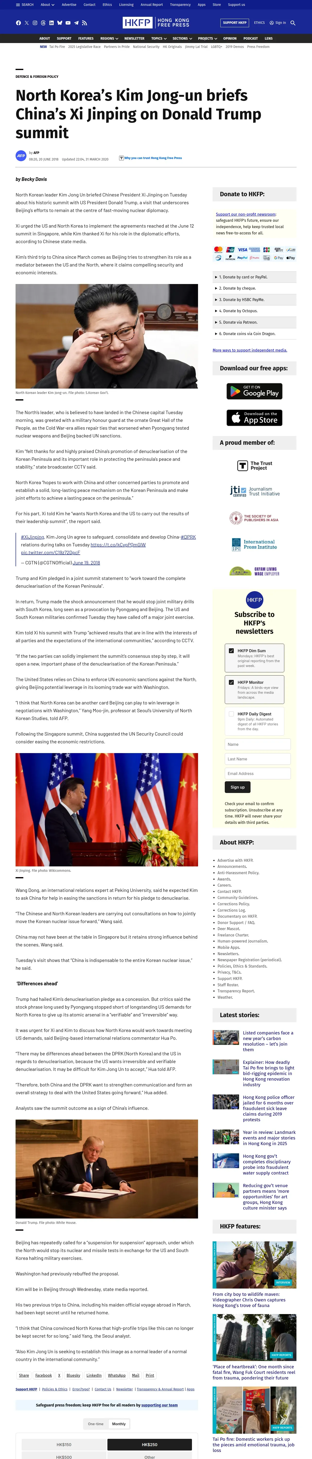 https://hongkongfp.com:443/2018/06/20/north-koreas-kim-jong-un-briefs-chinas-xi-jinping-donald-trump-summit/