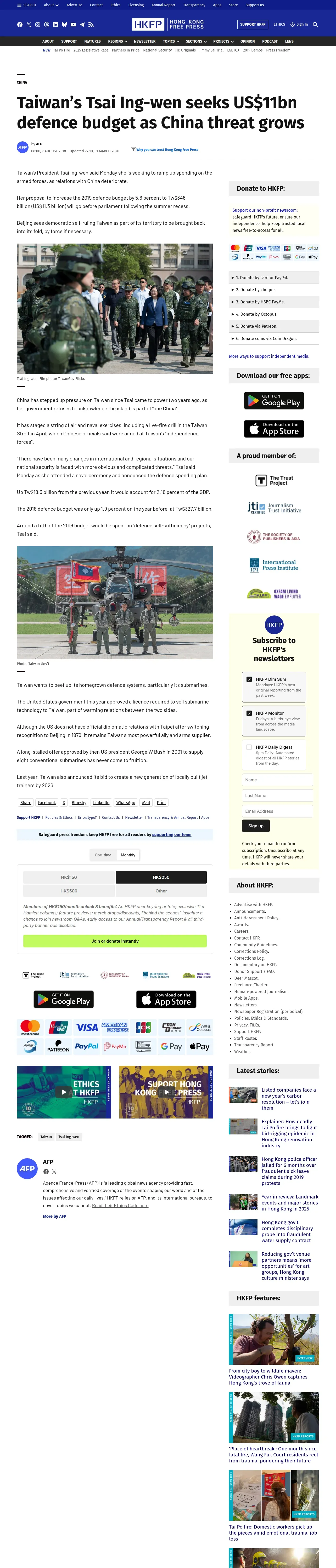 https://hongkongfp.com:443/2018/08/07/taiwans-tsai-ing-wen-seeks-us11bn-defence-budget-china-threat-grows/