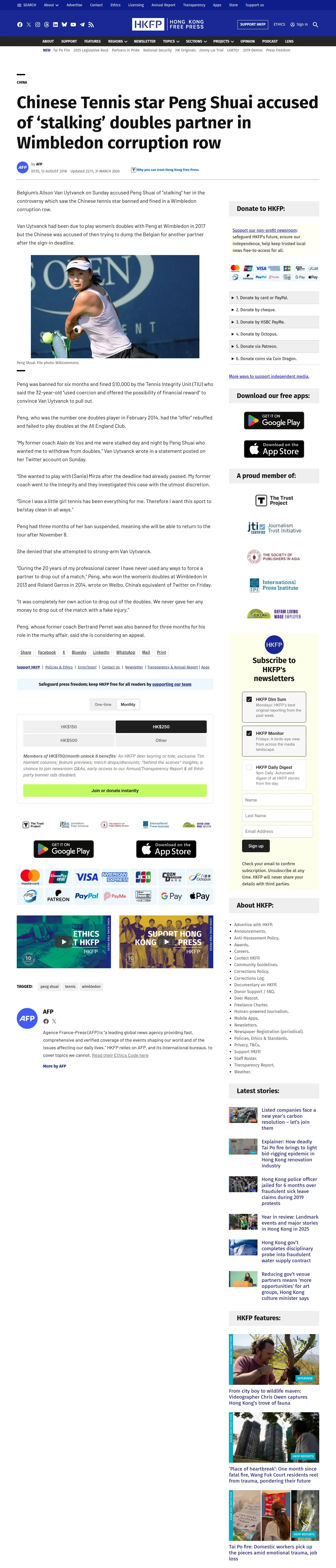 https://hongkongfp.com:443/2018/08/13/chinese-tennis-star-peng-shuai-accused-stalking-doubles-partner-wimbledon-corruption-row/
