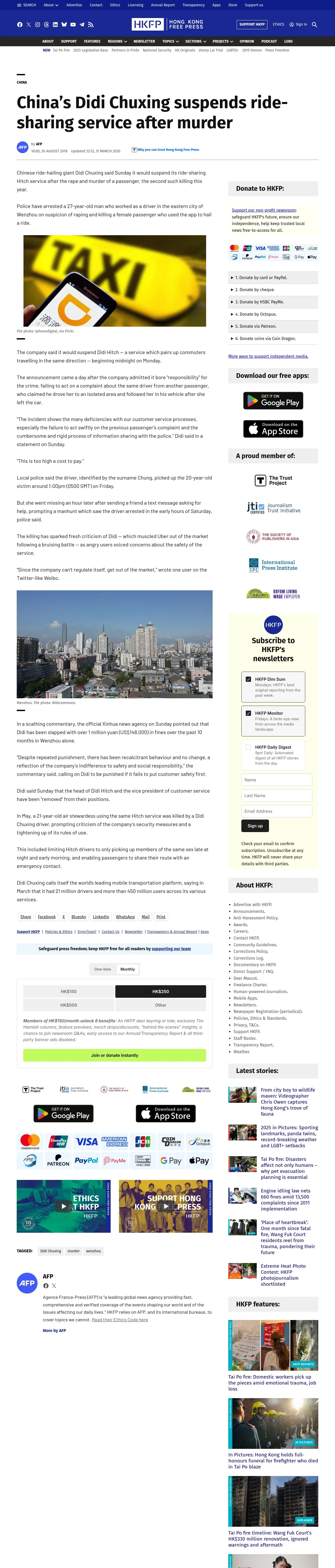 https://hongkongfp.com:443/2018/08/26/chinas-didi-chuxing-suspends-ride-sharing-service-murder/