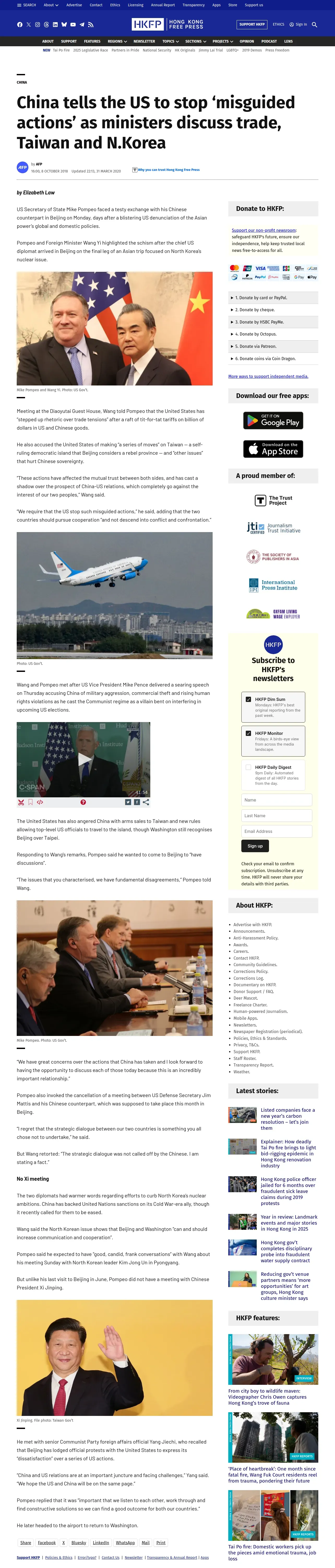 取得元URL: https://hongkongfp.com:443/2018/10/08/china-tells-us-stop-misguided-actions-ministers-discuss-trade-taiwan-n-korea/