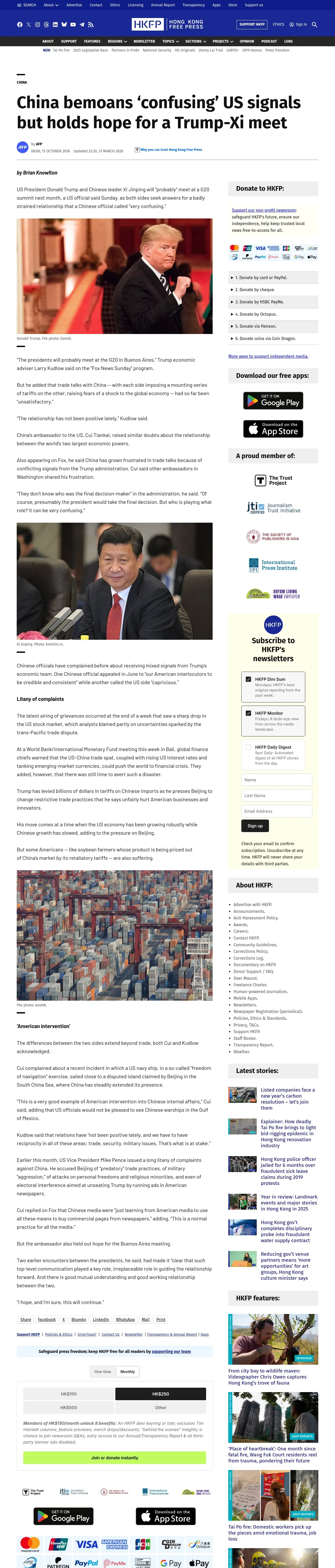 https://hongkongfp.com:443/2018/10/15/china-bemoans-confusing-us-signals-holds-hope-trump-xi-meet/