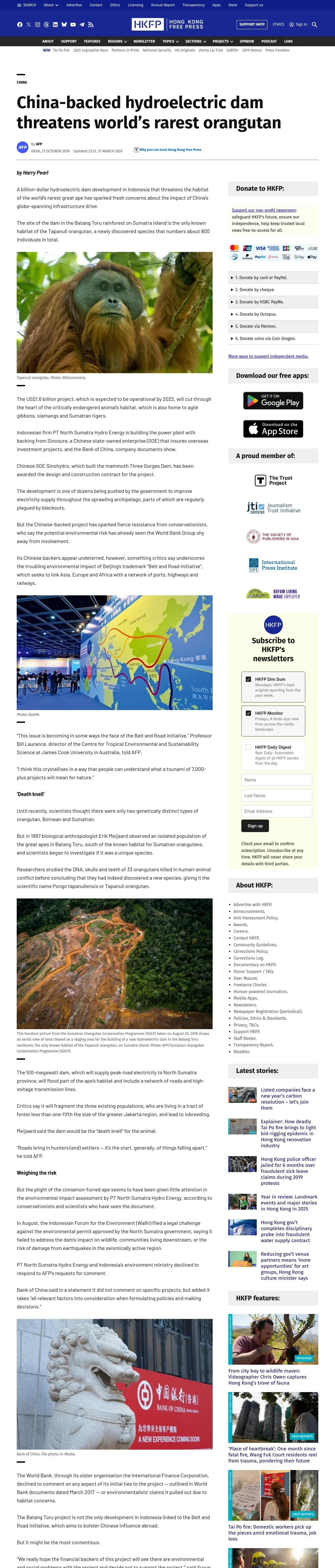 https://hongkongfp.com:443/2018/10/21/china-backed-hydroelectric-dam-threatens-worlds-rarest-orangutan/